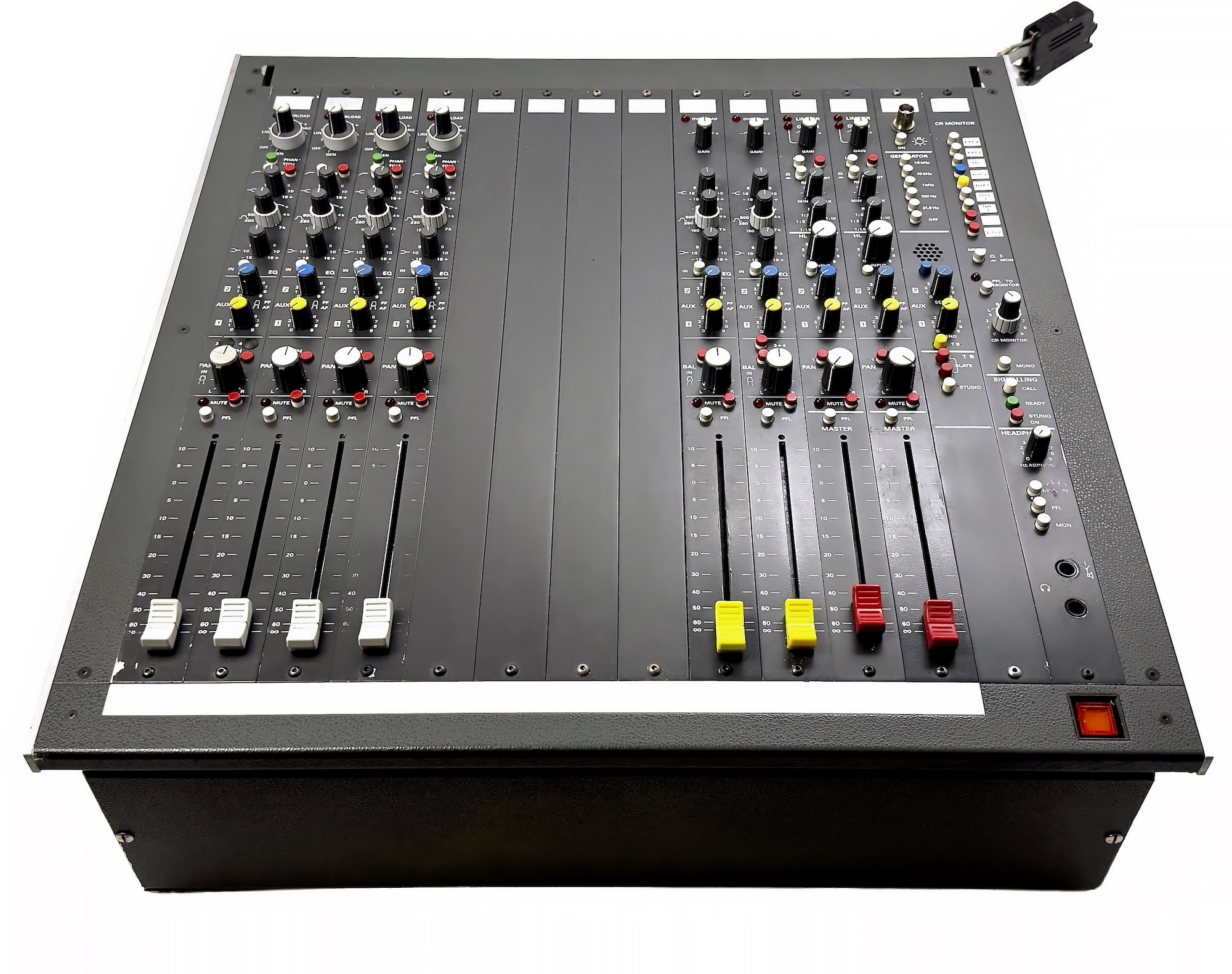 Alle festgestellten Mängel wurden behoben. Die Fader laufen gleichmäßig, und auch die Potentiometer sind leichtgängig. Optisch befindet sich das Pult in einem mittleren Zustand – es wurde nicht vollständig überholt, aber teilweise ist es bereits recappt worden als wir die Fehler repariert haben. Eine Garantie wird nicht übernommen, da die Kondensatoren inzwischen rund 30 Jahre alt sind. Eine Überholung ist auf Wunsch jederzeit als Upgrade möglich.